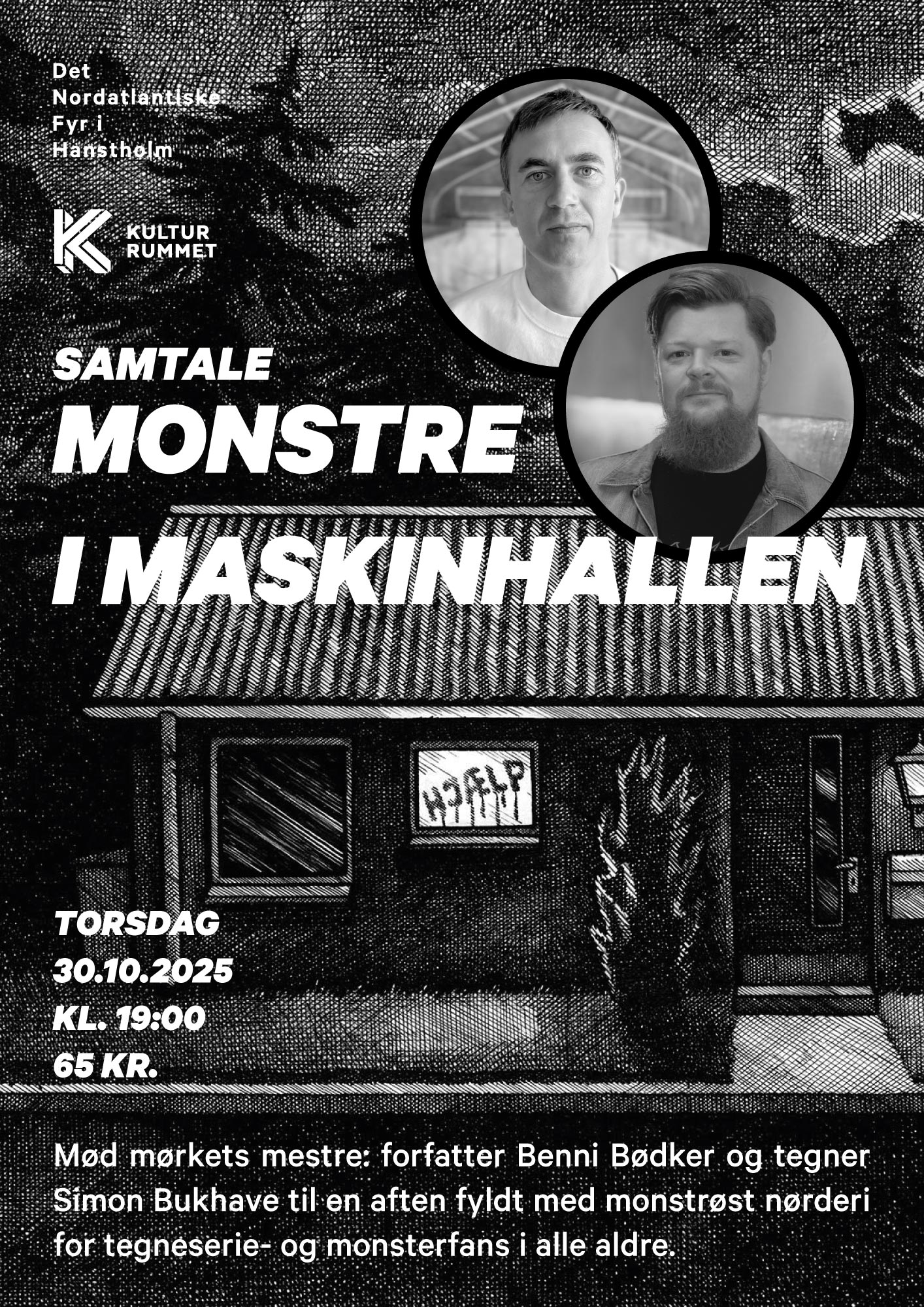 Mød mørkets mestre: forfatter Benni Bødker og tegner Simon Bukhave til en aften fyldt med monstrøst nørderi for tegneserie- og monsterfans i alle aldre, i Maskinhallen på Det Nordatlantiske Fyr i Hanstholm.